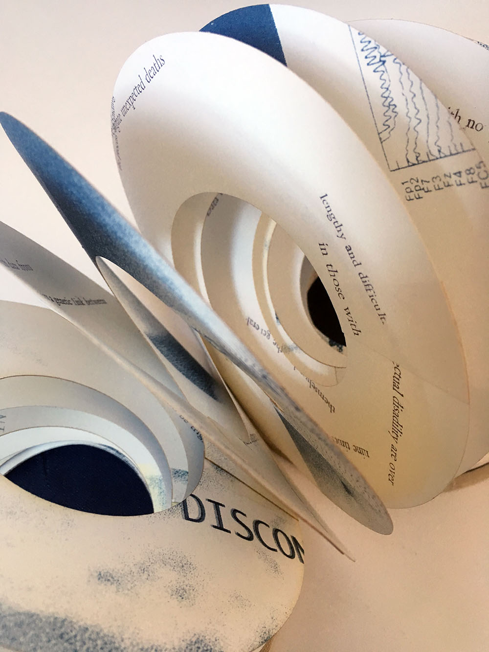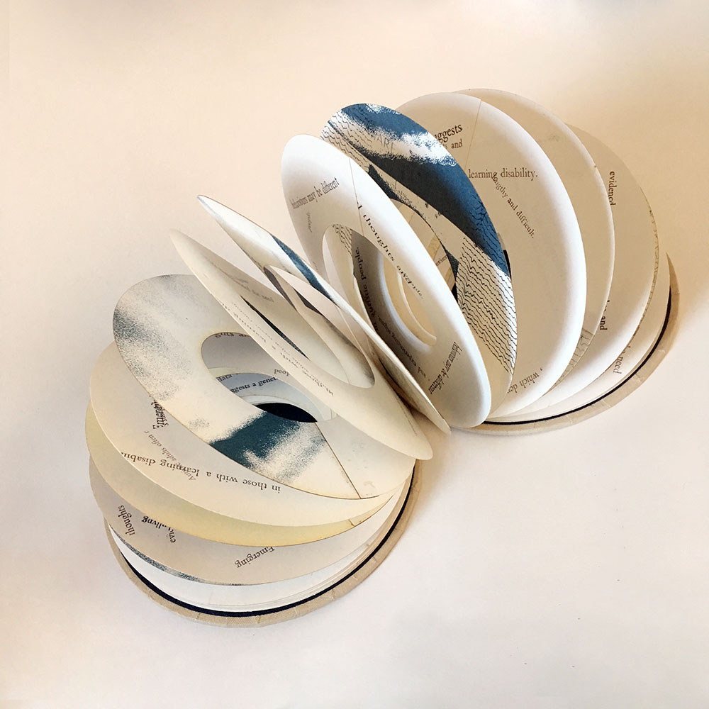 The book consists of two interlocking spirals which create a double helix. One helix is printed with a mix of phrases from Autistica’s Research Priorities Document. The other with screen-printed images of MRI scans of my brain and EEG’s of my brain activity. I have also integrated text from journals and notebooks that I keep.