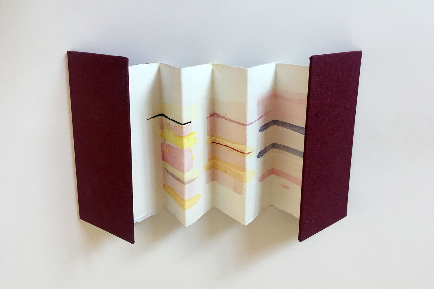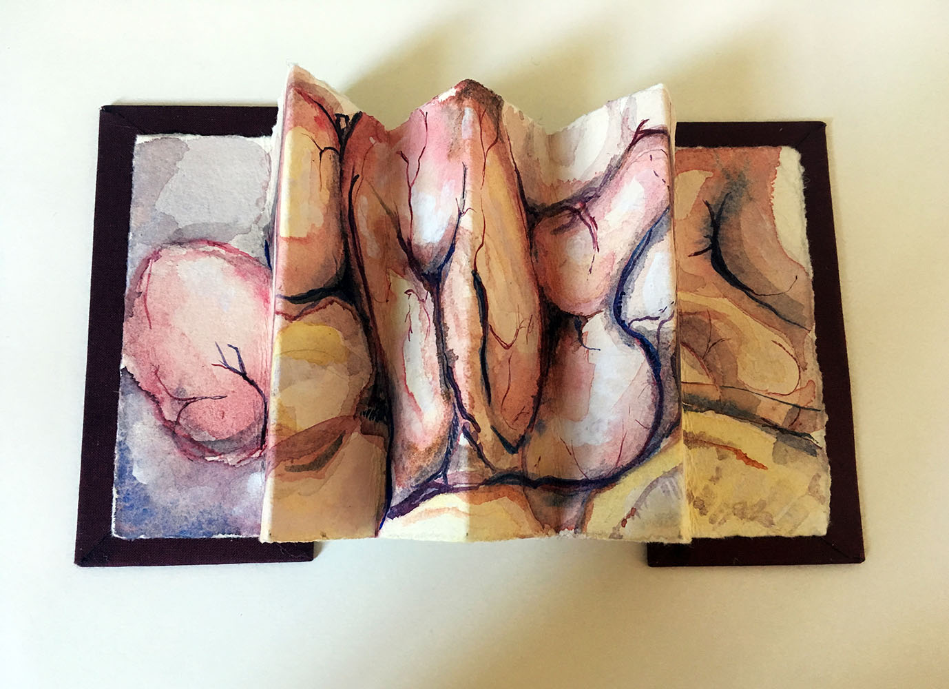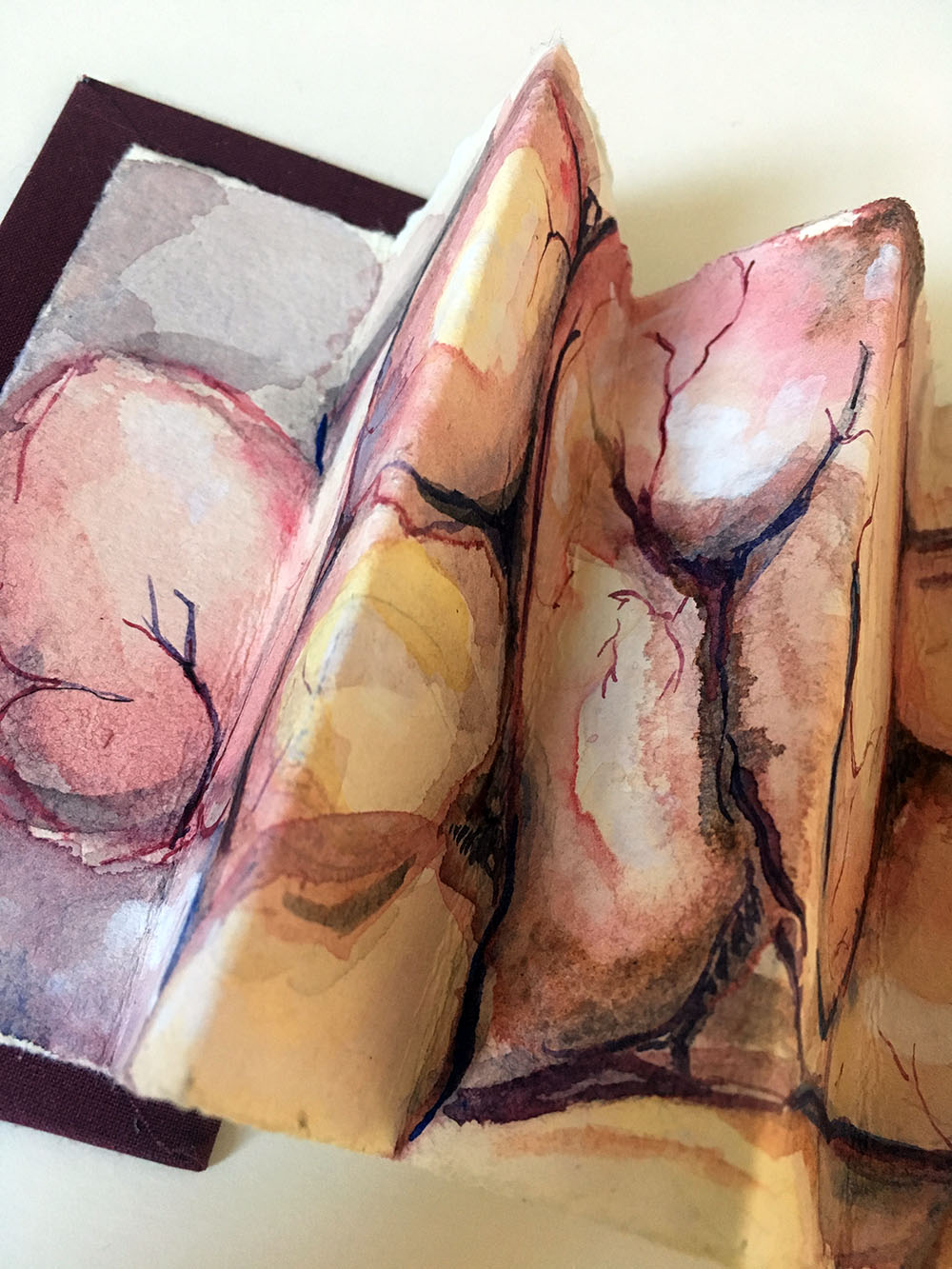 I finished the book with a classic concertina fold which neatly slices through the fleshy textures and I added covers in a deep wine red. The back shows swatches of the colours that I mixed in the process of making the paintings and I like the natural juxtapositions between soft and hard, finished and unfinished, healed and inhaled.