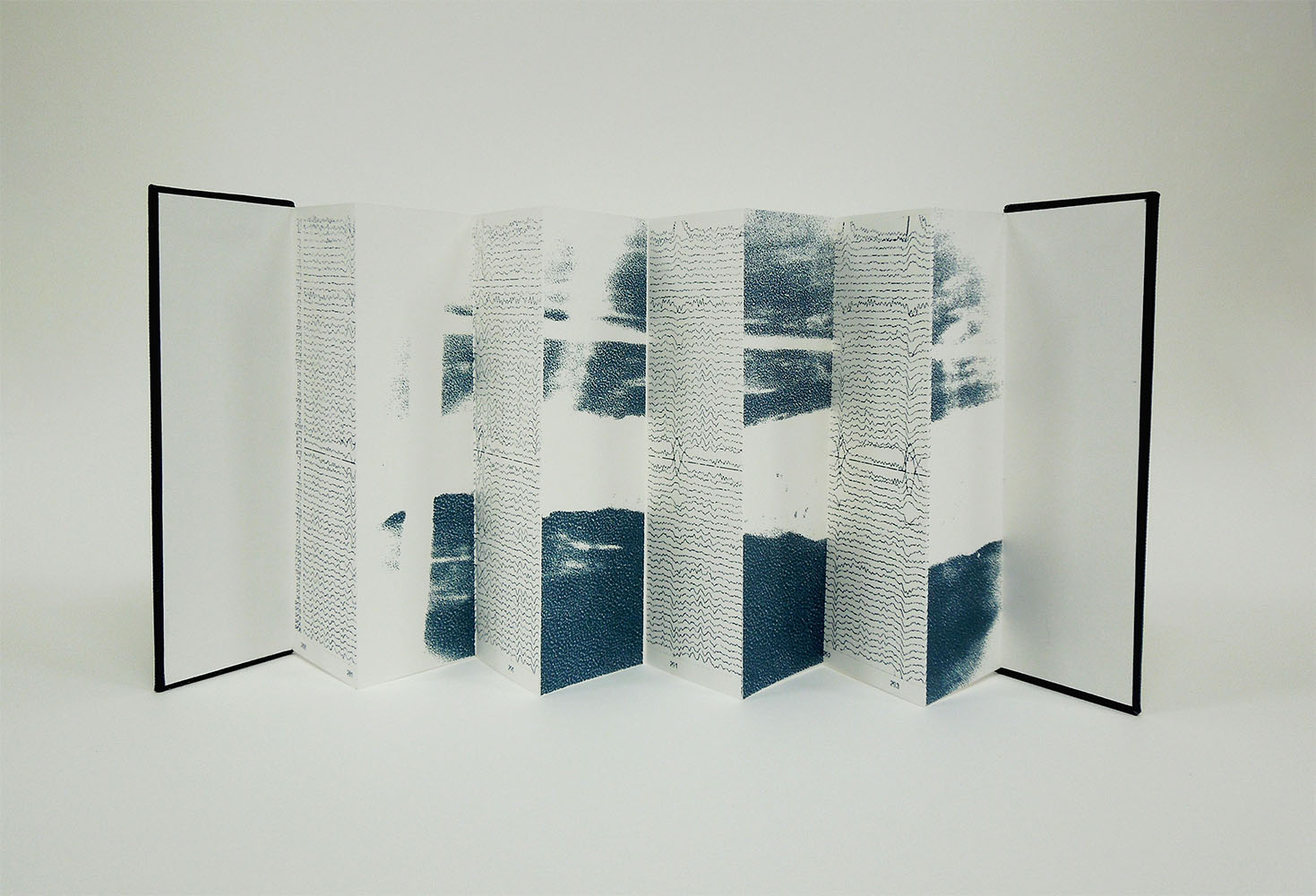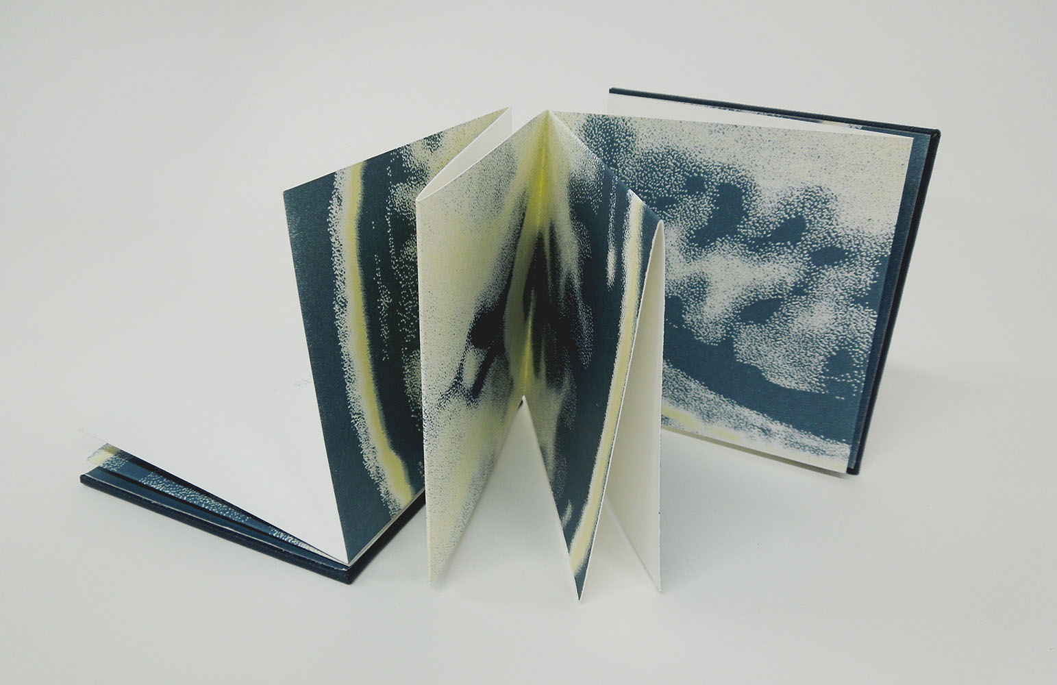 The Gaps Between is a series of artist books, made from Southbank smooth paper, greyboard and book cloth. The images are screen printed then folded by hand. The books explore my own fragmented neurology and how it affects my experience of ‘place’.